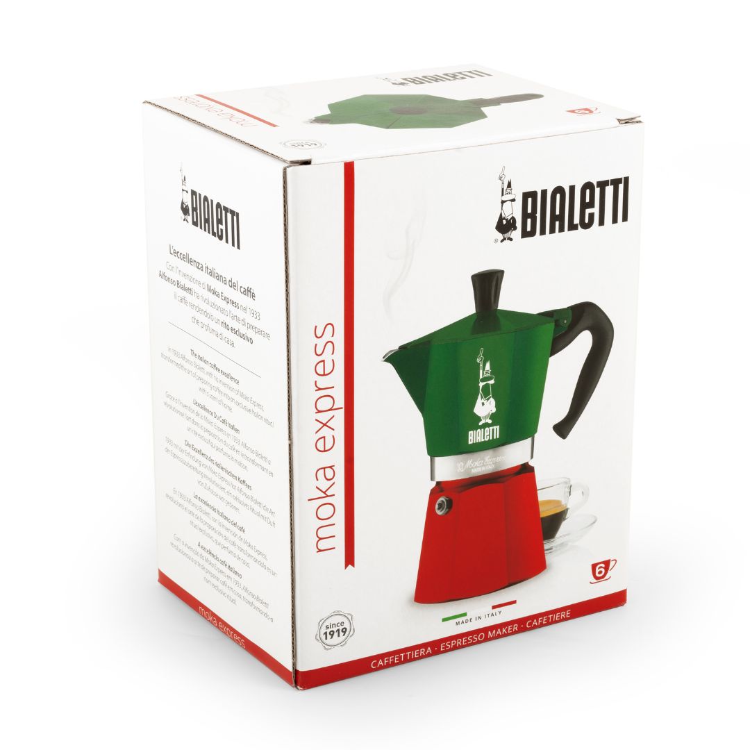 The iconic Man with the moustache was designed in 1953 by Italian artist Paul Campani. The Moka Express Tricolore is made in Italy and guarantees high quality, thanks also to the patented safety valve that makes it easy to clean. In addition, the ergonomic handle makes it easy to grip the product. The product is available in two sizes to meet different requirements, and is suitable for gas and electric hobs. The product can also be used on induction hobs together with the Bialetti induction plate adapter (sold separately). The item is available in 2 and 6-cup sizes. Enjoy the experience of preparing a good coffee, not only in terms of taste but also in aesthetics: with Moka Express Tricolore you can enjoy the taste of a good coffee while celebrating the colors of Made in Italy on an icon that has been wholly Italian since 1933.